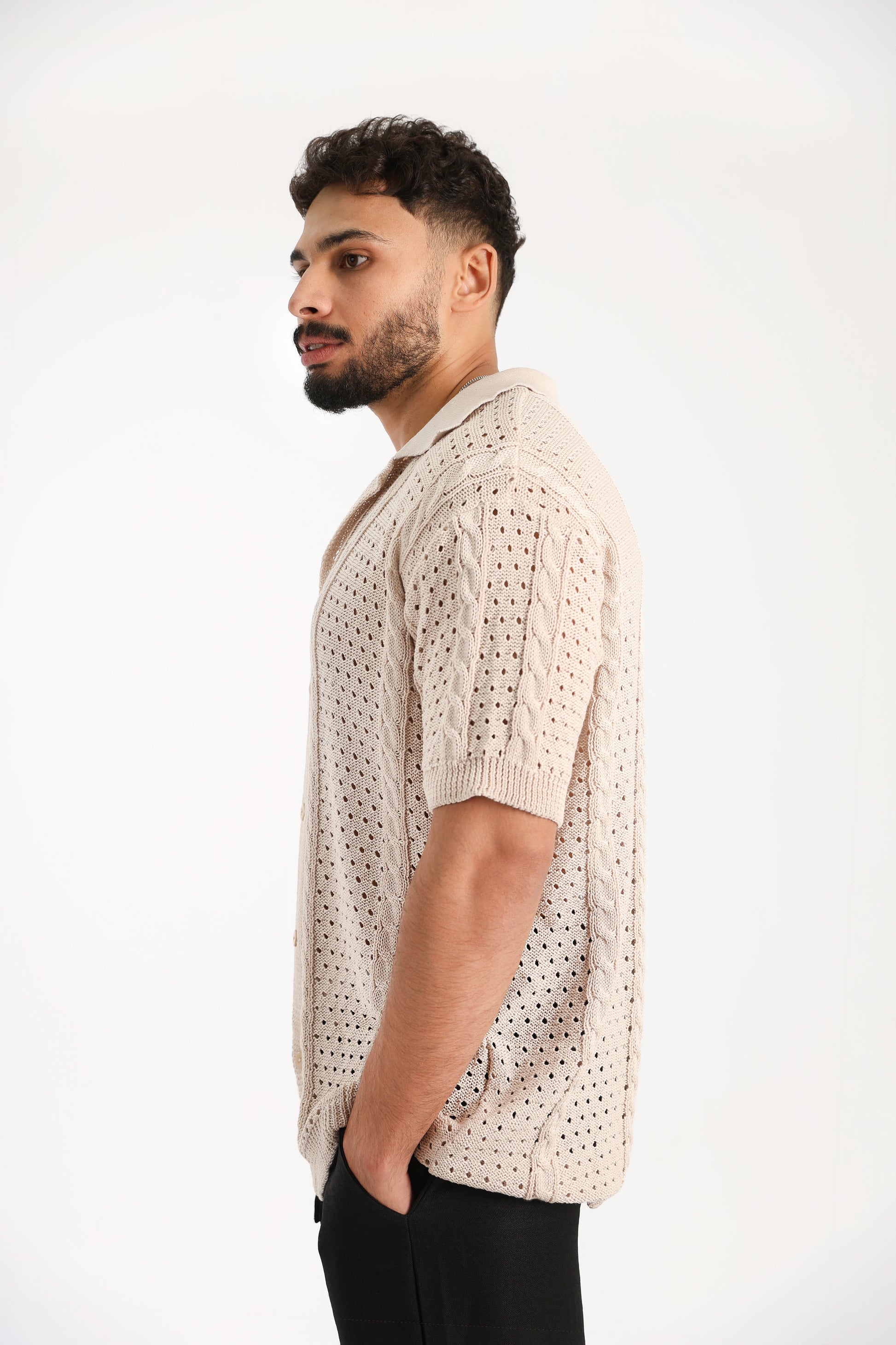 Designed for warm days and cool evenings, the Knitted Shirt offers breathable comfort with a relaxed fit. A versatile essential for effortless style—wherever the day takes you.